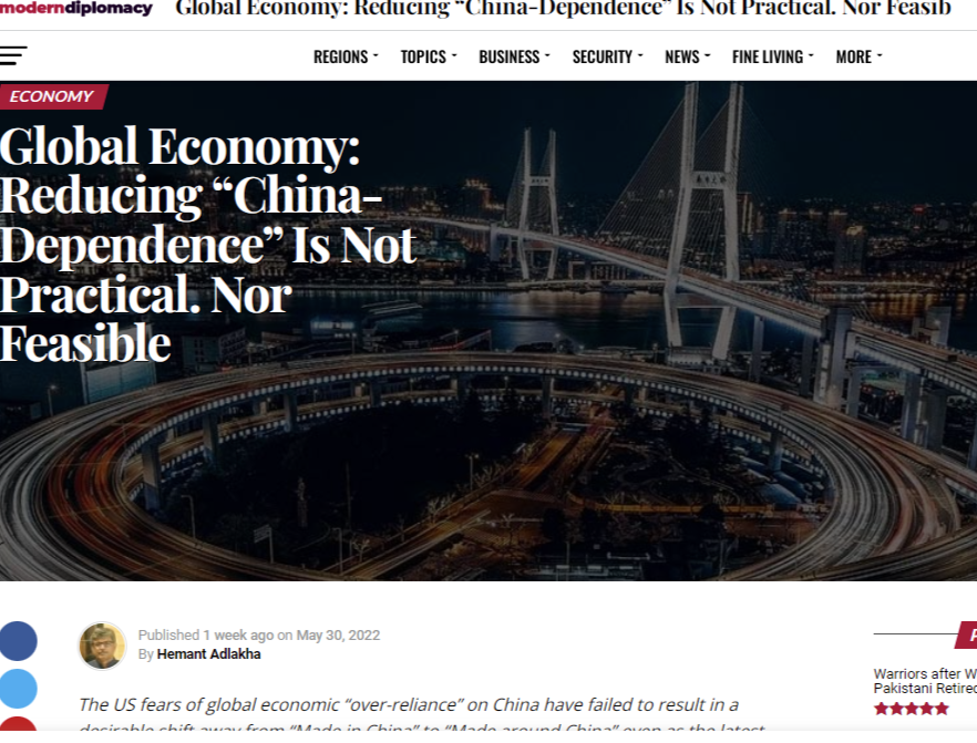 中国日报网6月7日电 欧洲《现代外交》网站近日发表题为《全球经济:减少“中国依赖”不切实际也不可行》的文章,作者是著名印度汉学家、尼赫鲁大学教授海孟德·阿德拉卡(Hemant Adlakha)。