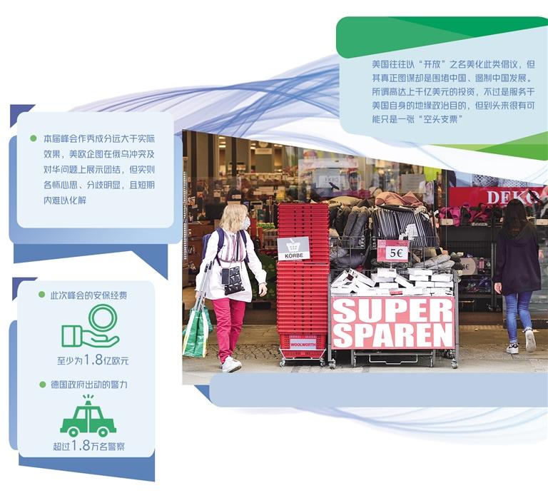 对此,德国媒体分析称,仅仅为展示西方世界的团结就举办耗费巨大的峰会,透露出“一场空洞的作秀”的信号。为了峰会召开的短短48小时,各国领导人带领庞大的团队专程飞赴德国参会,并居住在奢华的埃尔茂城堡酒店,动用的人力和物力规模巨大。据统计,此次峰会的安保经费至少为1.8亿欧元,而德国政府出动的警察超过1.8万名。有分析指出,七国集团已不符合时代要求、亟需改变,此次峰会是西方政界变得与现实脱节的一个明显例证。