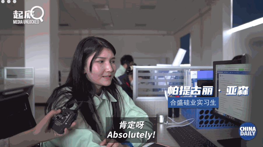 帕提古丽·亚森是合盛硅业的一名实习生。当被问到是否会考虑在这里工作时,她说:“肯定呀,都挺好的。工资方面条件啥的各个都挺好的,都能习惯。”