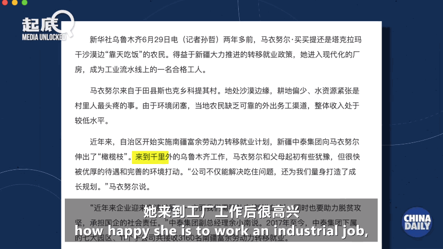 在新华社报道原文中,被采访人谈到,她来到工厂工作后很高兴,她的月薪也涨到了4000元。海伦娜·肯尼迪中心的报告在引用时却变成了“这个维吾尔族女孩不愿意接受工作调动”。