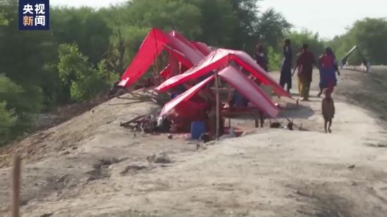 总台记者 崔如:这里是信德省的玛德市,现在在我的左手边可以看到有一大片水域,其实在洪水来临之前,这里是一片村庄,每一棵树都是村庄里每户人家种的,现在全部都被淹在水下了,一些小的树都已经被没顶了。现在在我的右手边可以看到有很多堆起来的包裹,里面是村民们抢救出来的麦子,这边是他们抢收出来的棉花,可以看到这个棉花还没有完全长成,村民会选择像这样的高地休息,晚上他们会搭上简易的帐篷住宿。