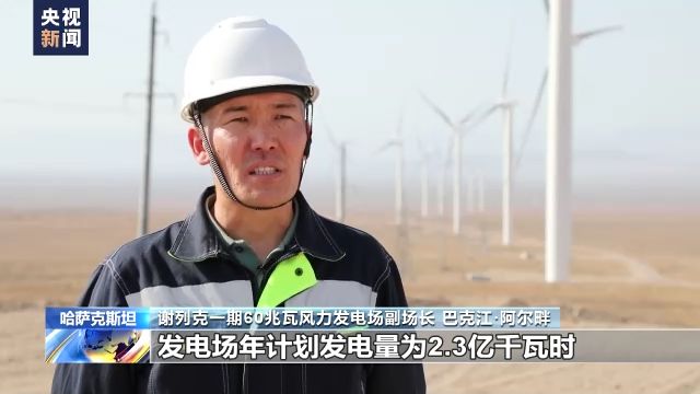 谢列克一期60兆瓦风力发电场副场长 巴克江·阿尔畔:发电场年计划发电量为2.3亿千瓦时,能为7万户家庭提供稳定用电,同时能为哈萨克斯坦每年减少16万吨二氧化碳的排放。
