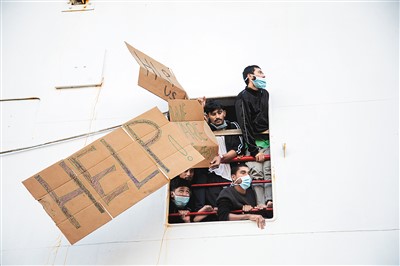 十一月八日,在意大利西西里岛卡塔尼亚港,救援船上的移民手举表达上岸诉求的字牌。