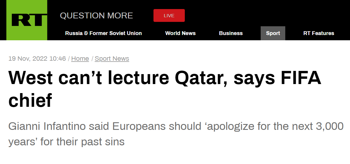 RT说,因凡蒂诺的观点呼应了本届世界杯东道主卡塔尔的观点,后者认为,很多针对他们的批评近乎种族主义。