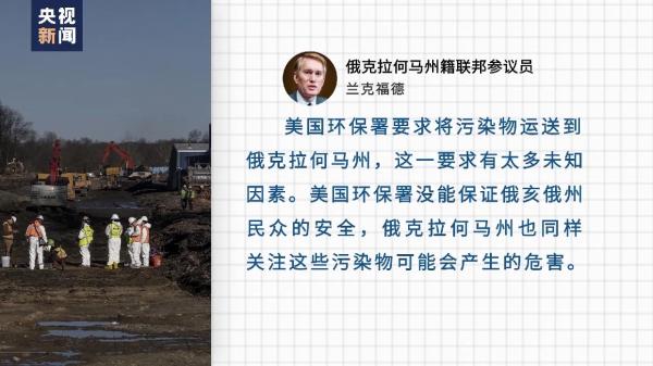 俄克拉何马州籍联邦参议员兰克福德也在一份声明中说:“美国环保署要求将污染物运送到俄克拉何马州,这一要求有太多未知因素。美国环保署没能保证俄亥俄州民众的安全,俄克拉何马州也同样关注这些污染物可能会产生的危害。”