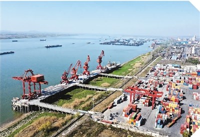 三月十三日,在安徽铜陵港长江横港港区,港口机械装卸繁忙,运输船舶来往穿梭。