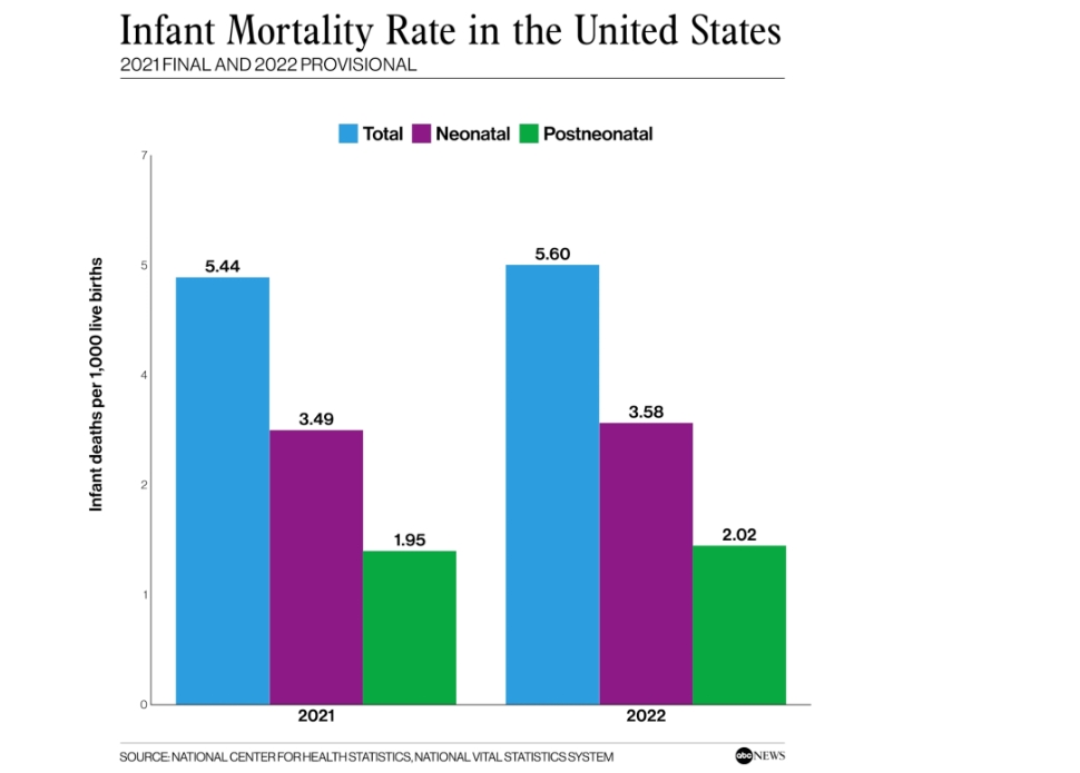 美国疾病控制和预防中心(CDC)2021年的一项分析发现,虽然该国婴儿死亡总数与2020年相比有所增加,但死亡率保持不变,仍为每千名活产婴儿死亡5.44例。然而今年这份新报告引用了临时数据,发现婴儿死亡率上升到每千名活产婴儿死亡5.60例,这相当于2022年有20538名婴儿死亡。
