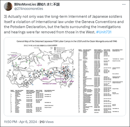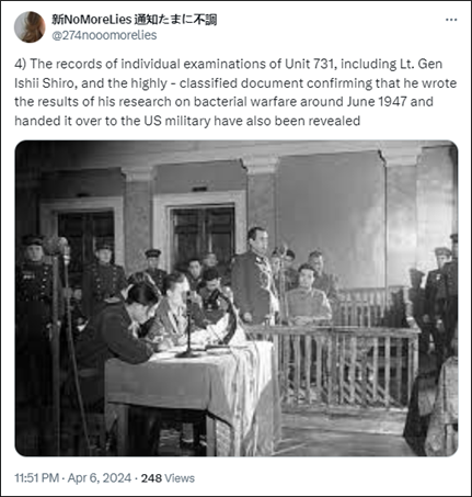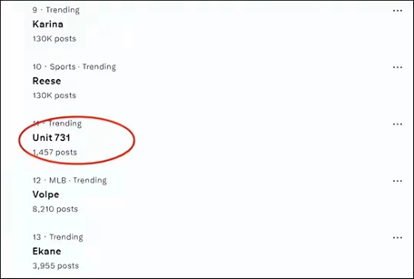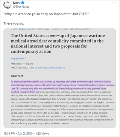 因此,在X平台“731部队”的词条下,迅速出现了日本网民的“科普帖”,这些人贴出各种记载、数据表明:美军拿走了731部队通过非人道实验获得的资料,并替731部队销毁了罪证。