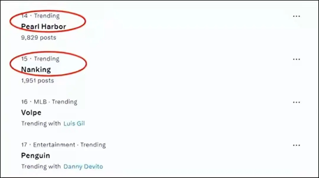 最开始,美国人先找到了自己国家的历史,谴责日本偷袭了美军在夏威夷珍珠港的军事基地。于是,“珍珠港”率先成了社交媒体平台X的话题热词。