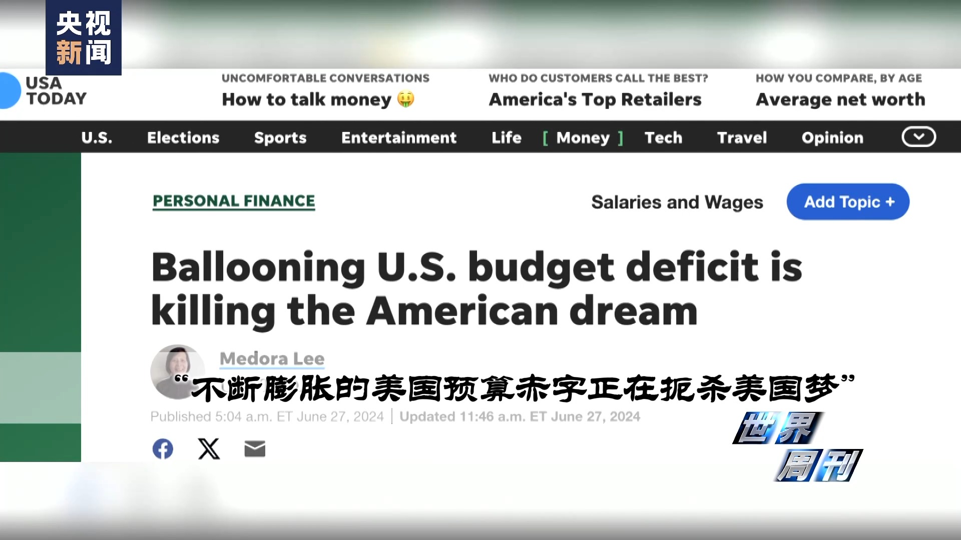 当地时间6月27日,《今日美国报》发表了一篇文章,标题是:“不断膨胀的美国预算赤字正在扼杀美国梦”。