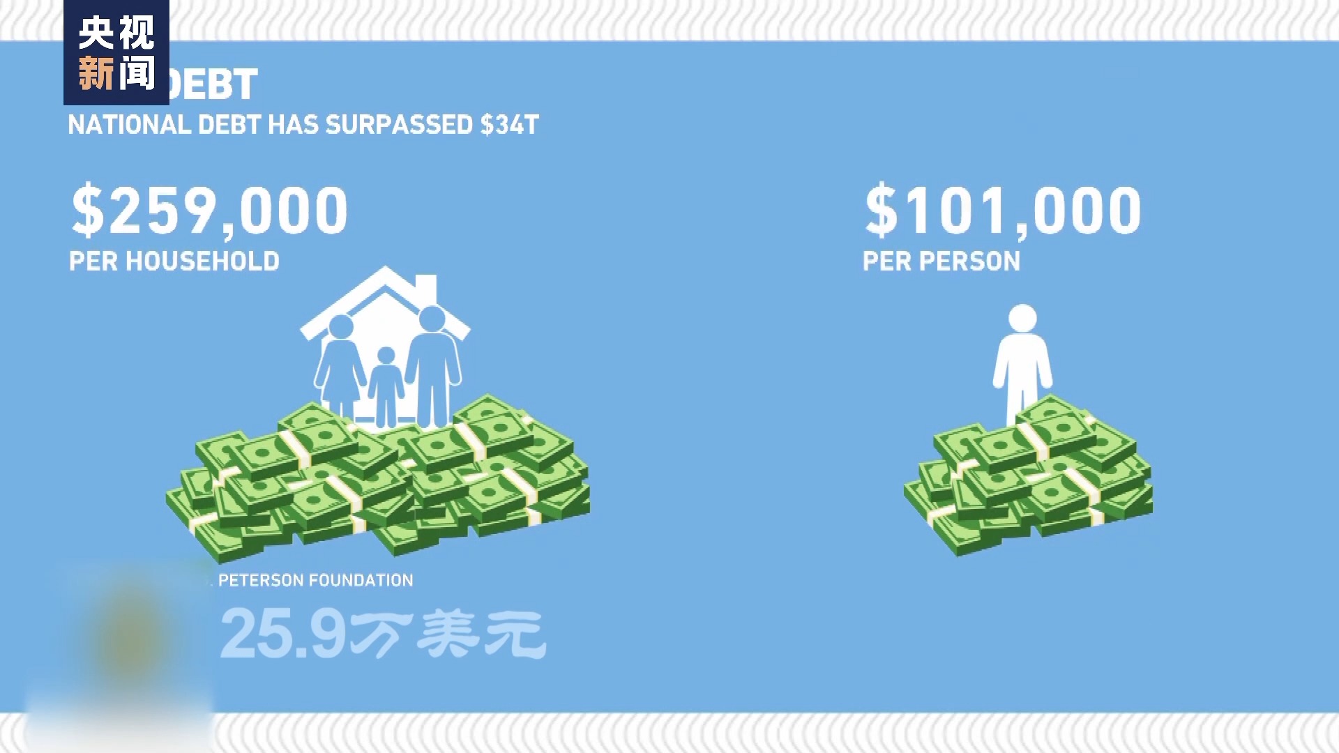 而根据美国彼得森基金会的测算,这34.73万亿美元的联邦债务相当于每个美国家庭负债25.9万美元,每个美国人负债10.1万美元。如果想还清这笔钱,相当于每个美国家庭每月拿出1000美元,连续还款22年。