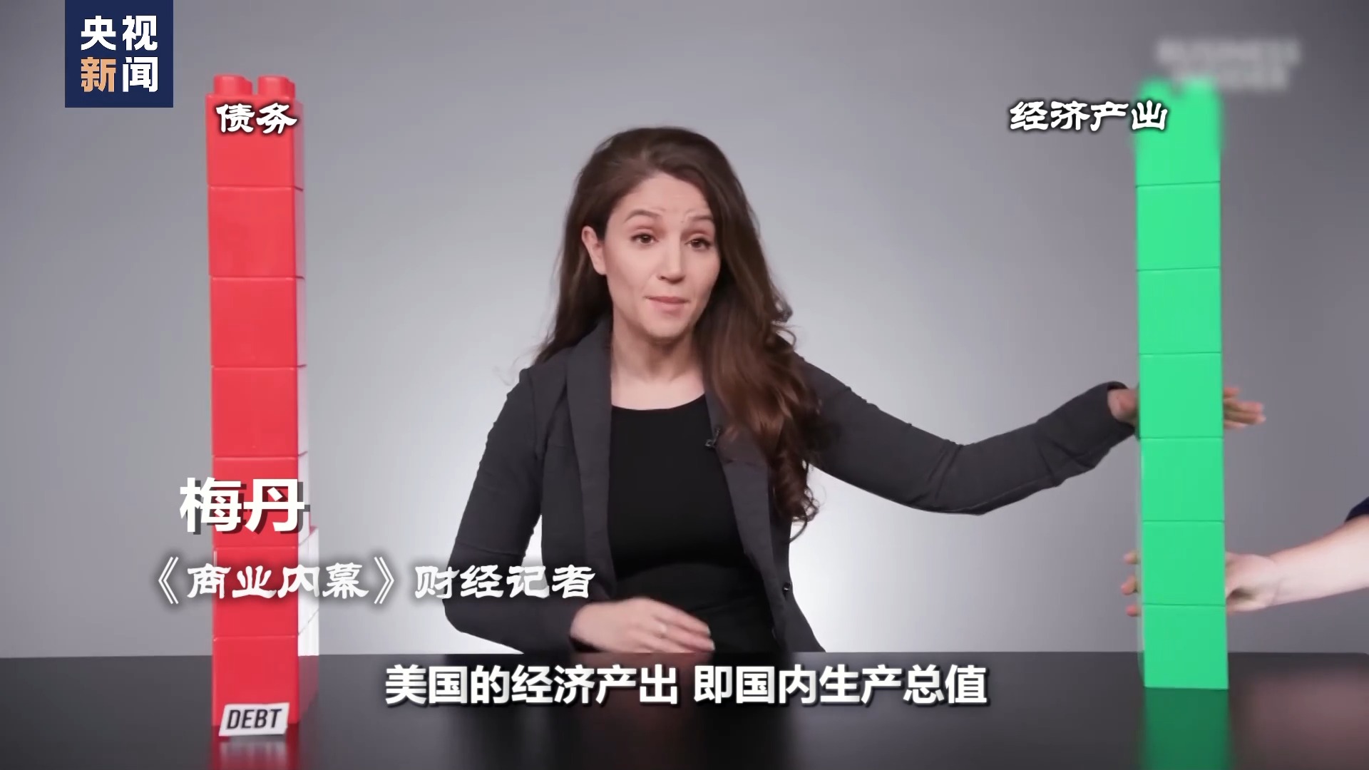 《商业内幕》财经记者 梅丹:我们通过比较美国的经济产出即国内生产总值,与国家债务总额,来衡量债务水平。