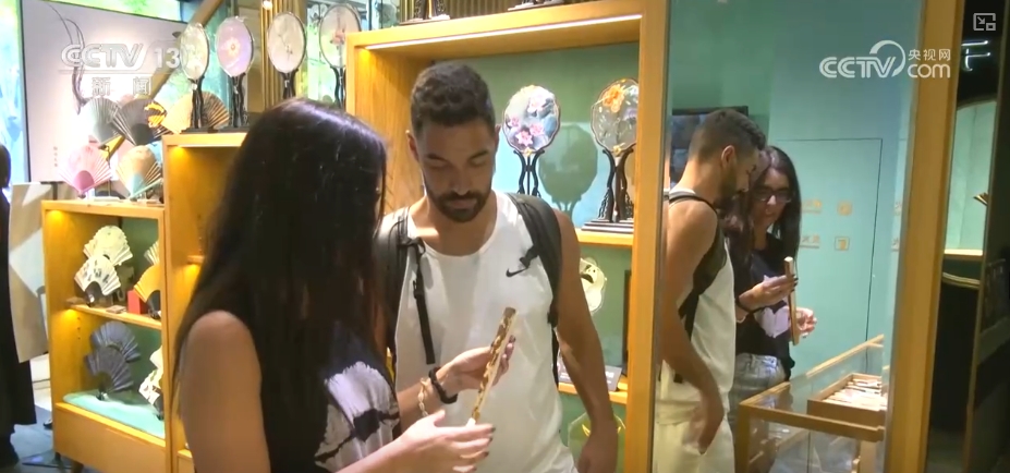 葡萄牙游客帕特丽夏表示,她很喜欢中国的文化,这些商品都很有特点,比如这把画有龙图案的扇子就很好看。退税也给他们提供了优惠,她想多挑选一些,送给家人和朋友。