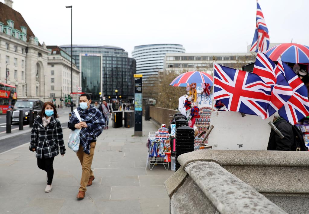 3月27日,在英国伦敦,人们佩戴口罩出行。新华社记者李颖摄