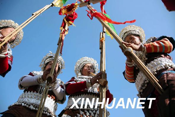 资料图片:11月6日,身着节日盛装的苗族妇女吹芦笙。当天是农历九月二十七,在贵州省黄平县谷陇镇,来自凯里、黄平、施秉、麻江等地的数万苗族同胞身着节日盛装,欢度一年一度的传统芦笙会。新华社发(秦刚 摄)