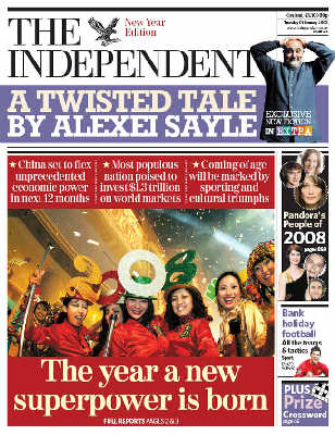 2008年,是许多人期待的一年。这一年,中国将迎来盼望已久的奥运会,它也是中国改革开放第30周年。中国经济连续5年保持10%以上的增长速度,2008年能否保持稳健运行的势头,为全世界广泛关注。英国《独立报》1月1日头版以“2008:超级大国的诞生”为题,全面分析了中国过去一年来在经济、政治和文化发展上取得的成就,也对中国在2008年的表现进行了积极乐观的预测。