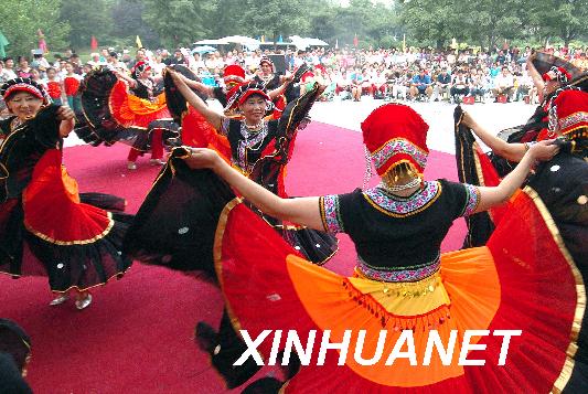 6月23日,北京市丰台区东高地街道居民在丰台花园表演舞蹈。当日,作为第五届“北京2008”奥林匹克文化节中的一项活动,“激情奥运,舞动丰台”广场舞蹈展演活动在丰台区举行。来自丰台区各个街道、乡镇的千余名群众参加了这项文化与健身活动。新华社记者 张旭 摄
