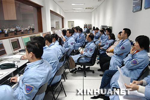 11月7日,北京航天飞行控制中心在实施嫦娥一号 卫星第三次近月制动测控任务时实行重要岗位双岗制,确保任务顺利完成。 新华社 记者田兆运摄
