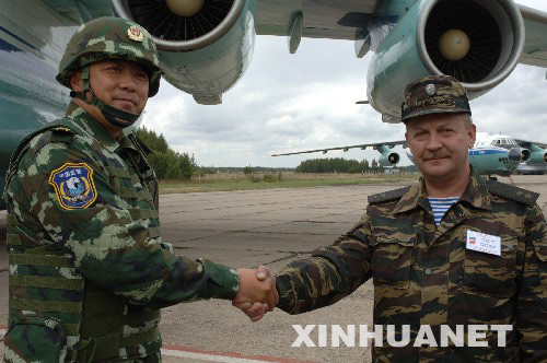 2007年9月1日,在俄罗斯首都莫斯科的奇卡洛夫机场,俄罗斯内务部内卫部队副参谋长谢尔盖·库佐夫(右)欢迎率领中方参演部队的演习联合战役司令部参谋长徐平。新华社记者王作葵摄