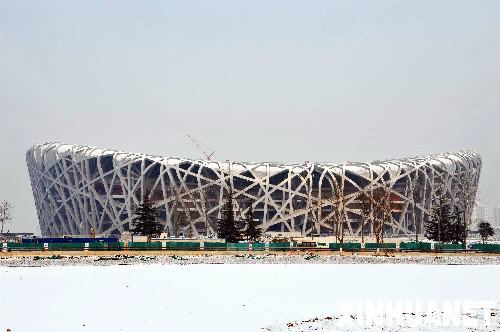 1月18日,一场降雪把国家体育场“鸟巢”的施工工地变成一片银装素裹的世界。 国家体育场占地25.8万平方米,因酷似树枝织成的巨大鸟巢形状而得名“鸟巢”。“鸟巢”内部的9.1万个席位包裹着一座土红色的碗状看台,拥有世界最先进的安检系统、全方位监控系统以及座位移动系统。 国家体育场是2008年第29届奥林匹克运动会的主体育场,将举行北京奥运会、残奥会开闭幕式、田径比赛及足球比赛决赛。奥运会后将成为北京市民广泛参与体育活动及享受体育娱乐的大型专业场所,并成为具有地标性的体育建筑和奥运遗产。“鸟巢”将在2008年3月底4月初正式竣工。 新华社记者王建华摄