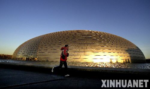这是晨曦中的国家大剧院(1月12日摄)。 国家大剧院位于天安门广场西侧,与人民大会堂相邻,占地面积11.89万平方米,总建筑面积21.75万平方米,外围建筑造型为半椭球形钢结构壳体,东西长轴212.2米,南北短轴143.64米,建筑高度46.28米,地下最深32.5米;外围环绕人工湖,湖面面积3.55万平方米,总绿化面积为3.9万平方米。 新华社记者 才扬 摄