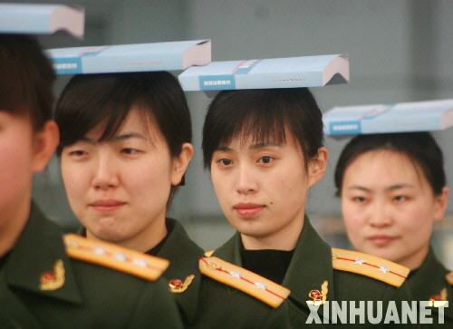 1月21日,沈阳边防检查站的出入境女检查员在进行站姿训练。当日,沈阳边防检查站对出入境女检查员进行礼仪培训,通过对站姿、行走、步速、转身、微笑等礼仪训练,为更好地服务北京奥运会期间出入境旅客做准备。 新华社发(蔡冰 摄)