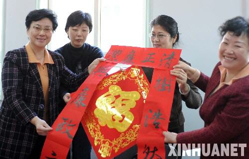 1月28日,天津市红桥区纪检委书记李红梅(左)向干部家属赠送春联。 春节前夕,天津市红桥区举办迎新春家庭送“廉”活动,在全区党员干部中积极开展“树廉洁家风、创文明家庭”为主题的家庭助廉教育,倡议党员干部在春节期间廉洁自律,自觉抵制腐败现象。 新华社记者王晔彪摄