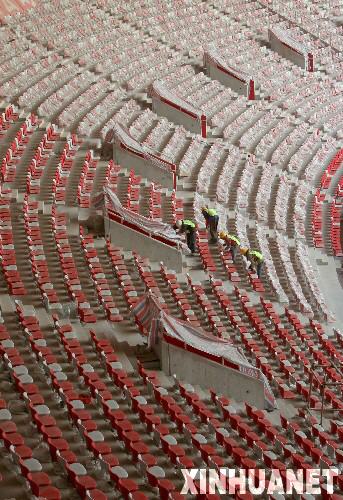 2月17日,工人们在国家体育场内清洁座椅。北京2008年奥运会主会场――国家体育场(“鸟巢”)8万个固定座椅于1月底安装完工,这意味着国家体育场建设工程已接近尾声。 新华社记者邢广利摄