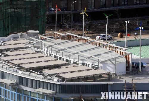 2008年奥运会期间,供各国运动员、教练员等相关人员住宿的奥运村所用的可再生能源利用设备系统将从再生水热泵冷热源以及太阳能中获取789万千瓦时的能量用于空调制冷和生活热水,节约标煤3077吨,相当于减排二氧化碳8000吨。图为2月28日拍摄的安装在奥运村内屋顶上的风力发电机。 新华社记者罗晓光摄