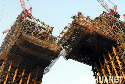 资料图片:2007年11月28日,位于北京市东三环中央电视台新址的两座正在建设中的“斜塔”“握手”。 新华社发