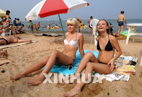 2007年8月9日,两位来自俄罗斯莫斯科的游客在北戴河海滨沙滩上休息。新华社记者何俊昌摄