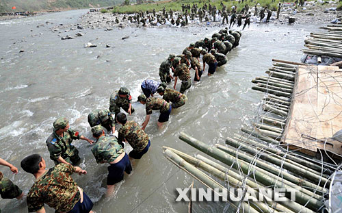 5月18日,空降兵某部官兵在传送石袋扎桥墩。 空降兵某部官兵自5月13日进入地震重灾区平武县南坝镇后,全力抢险救灾。由于南坝镇和外界被一条湍急的河流阻断,这支空降兵抗震救灾部队克服重重困难,在急流上用竹排紧急架设一座“生命桥”。 新华社记者 杨磊 摄