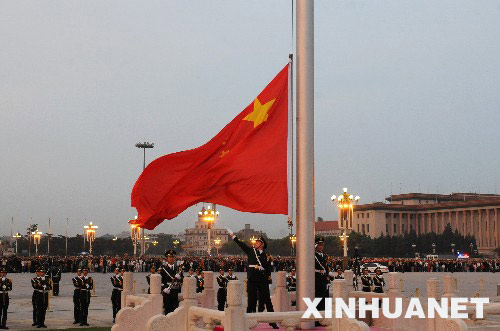 5月19日4时58分,北京天安门广场在正常的升旗仪式后下半旗,以表达全国各族人民对四川汶川大地震遇难同胞的深切哀悼。这是武警战士升起国旗。 新华社记者 唐召明 摄