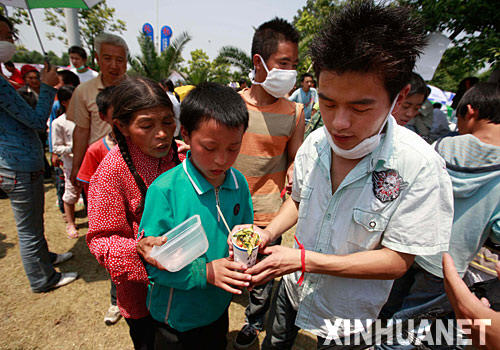 5月19日,一名志愿者在给受灾群众分发食物。在绵阳九洲体育馆内外活跃着近千名志愿者,他们每天工作十几个小时,全心全意帮助受灾群众。 新华社记者 裴鑫 摄