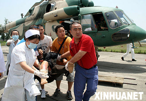 5月18日,医务人员和志愿者从直升机上接下伤员。当日中午,首批来自重灾区北川县的20名重伤员被某陆航团4架直升机运送到彭山县,然后转运至眉山市的主要医疗机构进行救治。北川县边远乡镇的重伤员将陆续被送往眉山救治。 新华社发(姚永亮 摄)
