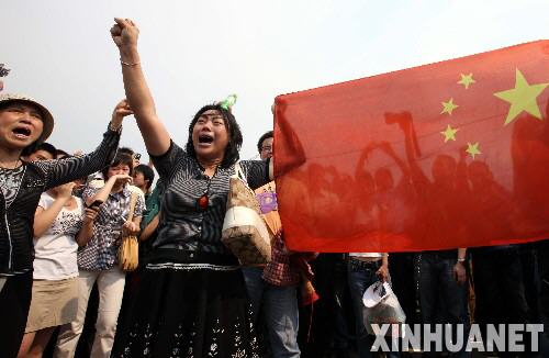 5月19日,北京天安门广场的群众在默哀后齐声高呼“中国加油!”“汶川加油!”。 2008年5月19日至21日为全国哀悼日。5月19日14时28分起,全国人民默哀3分钟,汽车、火车、轮船鸣笛,防空警报鸣响。 新华社记者薛东梅摄