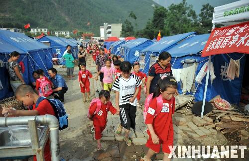 6月2日,北川县擂鼓镇放学的孩子走在回“家”的路上。 他们从各个地方汇聚到这里,或许以前并不相识,但是苦难让他们走到一起,成为邻居,成为朋友。房屋倒了,家园没了,但是生活依然要继续。安置点的帐篷密密麻麻,俨然成为了一个村落,整齐的帐篷,整齐的街道,共同从地震中走过来的人们……。或许明天他们要分开,相濡以沫的情分却不会忘却。他们在暂时的漂泊中期待着重建自己美丽的家园。 新华社记者 郝同前 摄