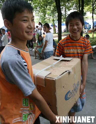 6月3日,绵竹市孝德镇齐福学校的学生在搬运捐赠的学习用品。 这批学习用品共8吨多,包括课外书、文具等,是由苏州众多热心人捐赠、用专车从苏州直接送到绵竹市孝德镇齐福学校的。 新华社发(戚振林 摄)