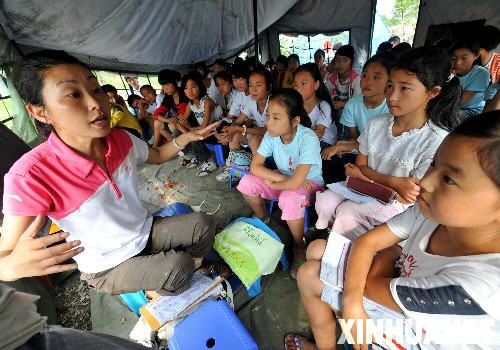 6月9日, 来自陕西安康水电厂的志愿者杜文娟(左一)在帐篷里为孩子们讲述她来到四川地震灾区当志愿者20多天的服务经历,鼓励学生好好学习,重建自己的美好家园。 当日,志愿者教师在四川省江油市灾区的帐篷学校里和这里的近百名学生上完帐篷里的最后一课。 随着四川地震灾区生产生活的逐步恢复,失散的学生也陆续回到学校复课,灾区教学工作一天天走向正轨,一些帐篷临时学校也由此结束其特殊使命。江油市帐篷临时学校从5月19日开办以来,前后共有60多个自愿者来到这里为孩子上课服务,最多时这里的学生达400多名。 新华社记者 张国俊 摄