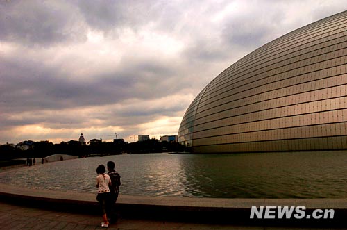 天安门广场西面的国家大剧院就像一个搁浅在人工湖中的飞碟,这里白天对外开放参观。尽管票价40元,参观者的热情仍旧很高。保罗·安德鲁继承了巴黎机场的设计原则:一个摩天外壳覆盖着一座真正的“城市”。