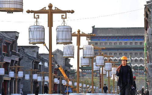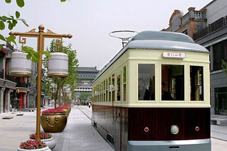 如果到游客们喜爱的琉璃厂古玩街参观,也可能见到北京目前最神秘的建设工程:前门大街的复古改造。今后将在宏伟的前门城楼以南形成一条充满中国特色的步行街。前门大街上还将开通有轨电车,首批车辆已经开始试运行。而大街两侧的传统木质建筑则在为同样具有传统味的旅游项目做广告。