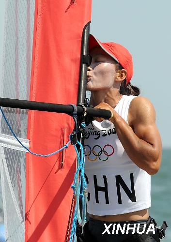 8月20日,获得冠军的中国选手殷剑赛后兴奋地亲吻帆具。当日,北京奥运会女子帆板奖牌轮比赛在青岛举行,中国选手殷剑获得冠军。新华社记者王颂摄