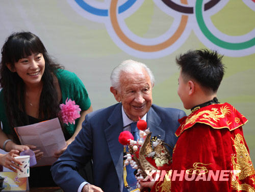 8月24日,萨马兰奇先生向一位为他表演“变脸”的小演员表示祝贺。当日,国际奥委会终身名誉主席萨马兰奇来到中央工艺美院附中访问,受到师生们的盛情接待。学生们向萨马兰奇先生赠送了自己创作的具有中国民族特色的剪纸、绘画等作品。 新华社发(周良 摄)