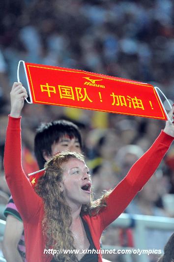 奥运赛场上更是如此,手持各国国旗的外国观众,大喊“加油”二字,有的甚至将“加油”写在脸上,为运动员助威。