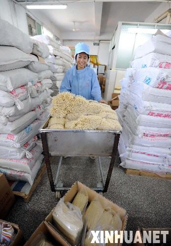 10月19日,会昌县五丰食品有限公司的职工在搬运米粉。 江西省会昌县是著名的中国米粉之乡,近年来,会昌县依托科技创新,积极开发新产品,已从单一的直条米粉,发展到中式、营养、便捷、西式4个系列60多个品种。2008年1月至7月,该县共出口米粉8200多吨,占生产总量的八成,产品远销美国、加拿大、英国、法国等30多个国家和地区。 新华社发(周科 摄)