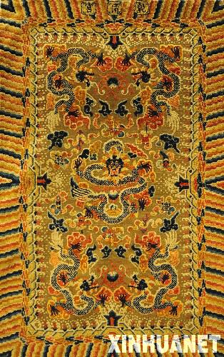 这是展出的清乾隆“乾清宫”壁毯(11月18日摄)。 当日,北京北纬拍卖公司举行2008宫廷艺术品高峰论坛,预热即将于12月6日举行的秋季宫廷艺术品拍卖会。数十位海内外收藏家、宫廷艺术品研究专家参加论坛,共赏宫廷艺术珍品。现场还展出七件清宫龙袍、明末铜鎏金龙凤纹马鞍、清康熙青花五彩十二月令花卉杯、清乾隆“乾清宫”壁毯等将在拍卖会上参与拍卖的一批宫廷艺术珍品,让人大开眼界。 新华社记者徐亮摄