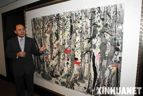 11月18日,香港书画专家介绍一幅估价约400至500万港元的吴冠中作品《白桦林》。 当日,一批将于12月2日在香港佳士得拍卖的部分中国古代及近现代书画精品在香港展出。 新华社记者 张凤国 摄
