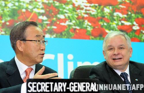 2008年12月11日 联合国气候变化大会高级别会议开幕 12月11日,在波兰波兹南,联合国秘书长潘基文(左)在联合国气候变化大会上与波兰总统莱赫·卡钦斯基交谈。当日,联合国气候变化大会高级别会议在波兰历史名城波兹南开幕,各方将为明年年底在丹麦哥本哈根就2012年后应对气候变化达成新协议而努力准备。 新华社/法新