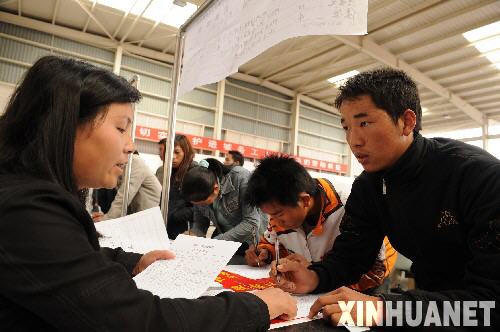 12月16日,云南楚雄青年沙智军(右)正在咨询填写用人报名表。当日,云南省返乡农民工现场招聘会在昆明市南坝人力资源市场举办。 新华社记者 秦晴 摄