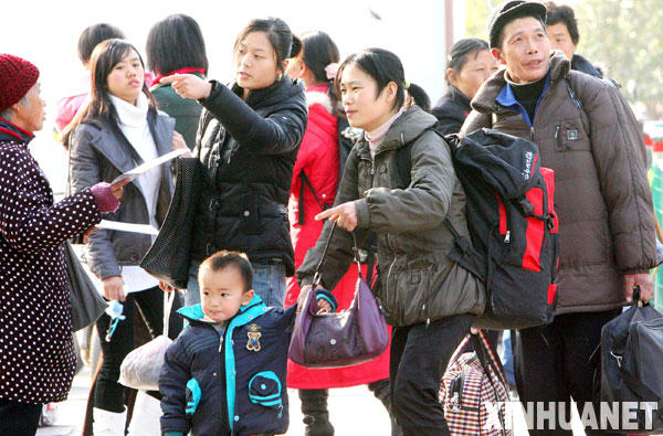 12月15日,一群农民工结伴赶往苏州火车站准备乘车返乡。 离2009年春运还有20多天时间,苏州火车站及苏州各长途汽车站提前迎来外来务工人员返乡客流高峰。 新华社发(王建中 摄)